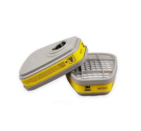 The 3M 6003 cartridge is NIOSH approved for protection against certain organic vapors and acid gases, the cartridge is labeled with the color code "yellow" within the NIOSH system. These cartridges can be used with various respiratory protection equipment, including 3M™ 6000 Series Half Facepieces, 6500/6500QL Series, 7500 Series, 6000 Series Full Facepieces, FF-400 Series, 7800 Series, and 3M™ Scott™ AV- 3000 HT and AV-3000 SureSeal Facepieces equipped with AV-632 Bayonet Adapter.